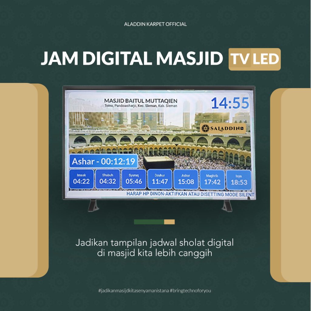 Desain yang Sesuai dengan Interior Masjid Jam digital masjid biasanya memiliki desain yang elegan dan modern, sehingga sangat cocok untuk dipasang di berbagai sudut masjid. Dengan desain yang sederhana namun futuristik, jam digital ini tidak hanya berfungsi secara praktis, tetapi juga menambah keindahan interior masjid.